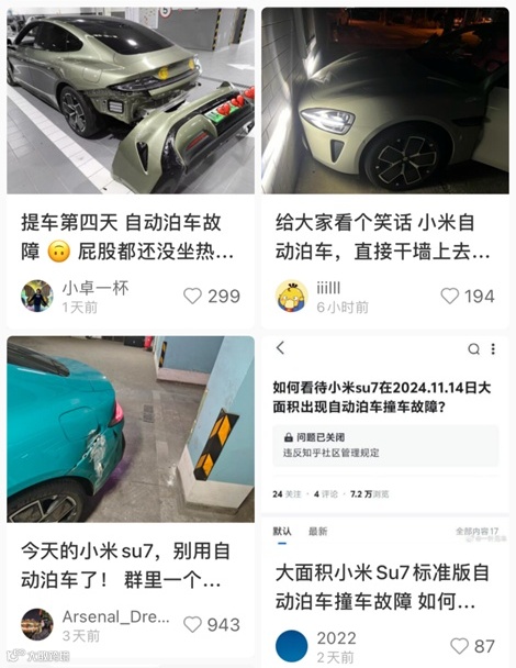 11月22日消息,近日,有多名车主反映,小米汽车SU7标准版“自动泊车”功能出现故障,造成不同程度的撞击、剐蹭损伤。根据统计,共有70多位小米SU7标准版车主在11月14日中午至11月15日凌晨因自动泊车功能,导致车辆发生事故。
