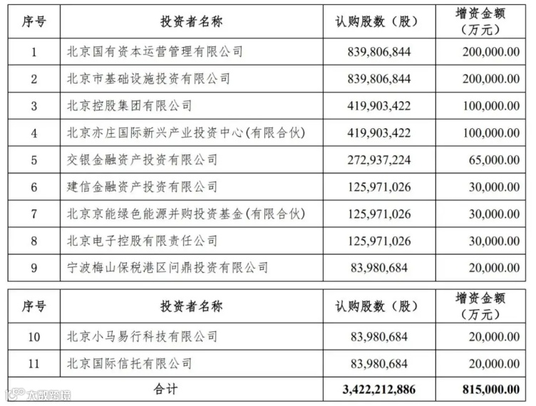 12月16日,北汽蓝谷子公司北汽新能源与北京汽车签署了《增资协议》,此次增资价格为每股人民币2.3815元,涉及股份数量为8.398亿股,增资总额20亿元;12月24日,北汽蓝谷发布子公司增资扩股进展公告显示,子公司北汽新能源引入北京国有资本运营管理有限公司、北京市基础设施投资有限公司、北京控股集团有限公司、北京小马易行科技有限公司等11家战略投资者并签署了《增资协议》,合计获得增资81.5亿元……