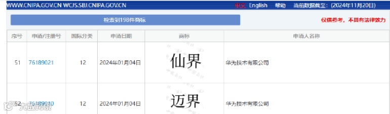 中工汽车网消息,11月22日,国家知识产权局商标局官网信息显示,华为技术有限公司成功注册了多件商标。其中,以“界”为关键词搜索发现,华为作为申请人共有198件相关商标,包括尊界、傲界、合界、御界、天界、仙界……