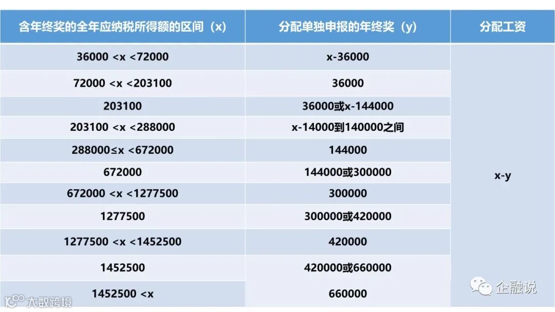 当含年终奖的全年应纳税所得额(X)大于36000时,由于年终奖单独申报存在雷区等原因,为使税负最低,可在年终奖和工资之间进行分配,分配的年终奖按照全年一次性奖金单独申报更节税。