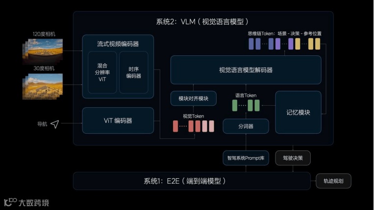 其次,“VLM视觉语言”模型由一个统一的Transformer模型组成。其参数量达到22亿,对物理世界的复杂交通环境具有强大的理解能力,即使面对首次经历的未知场景也能自如应对。可以识别路面平整度、光线等环境信息。也具备更强的导航地图理解能力,可以配合车机系统修正导航,预防驾驶时走错路线。还可以理解公交车道、潮汐车道和分时段限行等复杂的交通规则。
