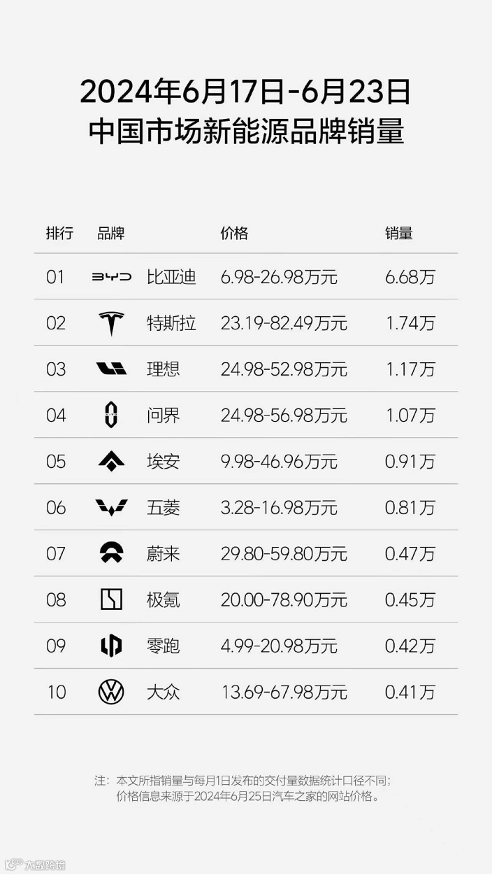 比亚迪以6.68万辆的销量领先所有对手,是接近后7家销量的总和,是理想汽车的5.70倍;此外,特斯拉1.74万辆、理想1.17万辆、问界1.07万辆、埃安0.91万辆、五菱0.81万辆,分列二到五名。其中,大众汽车以0.41万辆的销量排名第十,是前十中唯一的合资品牌。