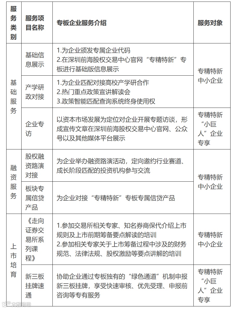 深圳“专精特新”专板构建了全链条、全流程、全周期的企业培育孵化体系,为广大中小企业提供基础服务、融资服务和上市培育服务,具体服务情况详见下表: