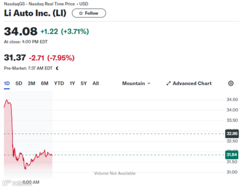公告发布后,理想汽车美股盘前一度重挫7%。