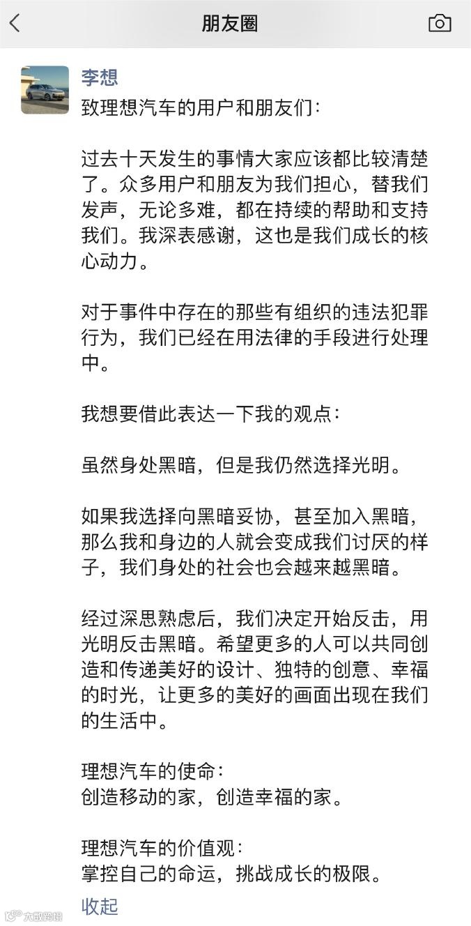 “过去十天发生的事情大家应该都比较清楚了。众多用户和朋友为我们担心,替我们发声,无论多难,都在持续的帮助和支持我们。我深表感谢,这也是我们成长的核心动力。”李想这样说道。