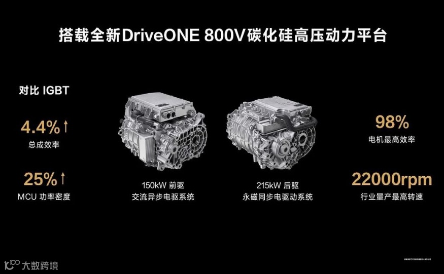 动力方面:智界S7基于全新DriveONE 800V碳化硅高压动力平台打造,提供单电机版和双电机四驱版供消费者选择,其中前电机最大功率为150kW,后电机最大功率为215kW,四驱版总功率365kW,具备3.3秒破百的性能实力。