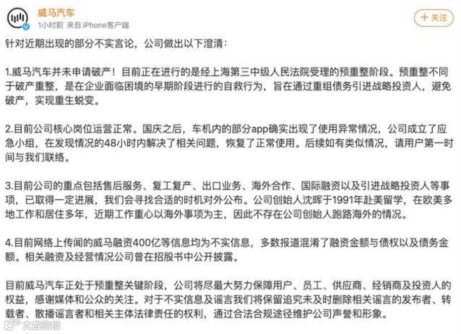 新旧势力交锋背后,是一个正在巨变的汽车市场。有句话说得好“中国最不缺的就是造车企业”。2018年,华尔街日报统计,中国新能源汽车制造商已经超过了487家。到了2023年,能够正常经营的新能源车企仅剩下40多家。粗略计算,在短短五年时间,有超过400家新能源汽车企业消失。汽车产业大变革,车企两级分化愈发严重。淘汰赛开始。在新市场环境下,几经波折的威马汽车能通过与开心汽车的合作找到新路径吗,这一问题的答案将逐渐明晰。 “破产重组”挣扎出海在劲爆故事不输娱乐圈的汽车圈里,令人唏嘘不已的新闻也从不缺席。2015年,威马汽车高光开局,创始人沈晖是汽车行业老人,相较一众出身互联网的创业者,显然更具经验优势。2017年,威马汽车“Always On 无威不智”品牌发布会于上海举行,该品牌的首款量产车型EX5也一并推出。2019年,威马汽车交付1.68万辆,位居造车新势力第二位,仅次于蔚来汽车的2.06万辆。2022年,威马的销量下滑显著、资金链断裂,根据威马汽车此前披露的招股书,2019—2021年,其归母净利润分别亏损44.45亿元、50.84亿元,以及82.05亿元,三年间共计亏损174亿元。2023年,“全员停薪留职”、“欠薪搬离总部”、“员工在线讨薪”、“威马服务中心不能提供维修服务”等消息被相继曝出,一度被业内认为威马快不行了。10月10日,一纸通告彻底击碎了威马的幻梦。威马汽车公开申请破产重整,由上海市第三终极人民法院承办。经查询,威马汽车风险信息一栏共标记了20多条被执行人信息,被冻结股权数额已超过100亿元。