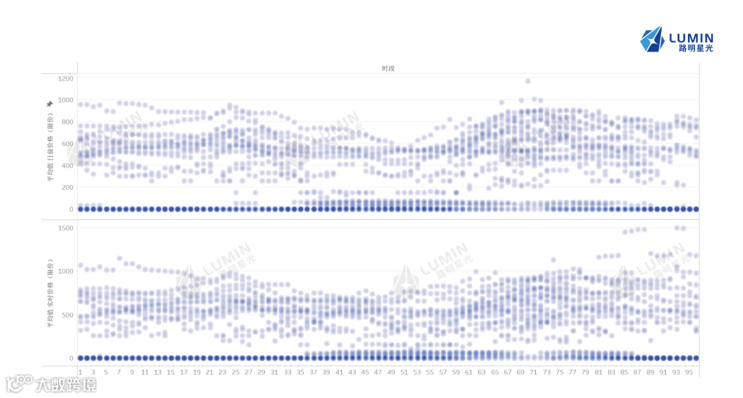 同时,观察日前价格在96个时段的分布密度图(上图上部分的图表),可以发现,除了明显的零价线外,从0点一直到大约15点之间,价格分布的情况波动较小,然而15点之后,价格波动情况逐渐增大,尤其在晚高峰时段。同时,9月份吉林市场的零价更容易出现在凌晨时段(23点-5点)。