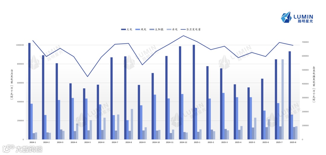 吉林省发电结构以火电为主力。风电出力特性受气象因素驱动,存在显著的季节波动,表现为明显的大小风季;而光伏发电量则随装机容量增长呈现稳步上升趋势。2025年8月,吉林省全口径发电量完成近100亿千瓦时。其中:火电机组(含燃煤、燃气、余热、垃圾、农林生物质)当月发电量约63.3亿千瓦时,占比63.5%;风电当月发电量约17.8亿千瓦时,占比17.8%;光伏当月发电量约8.9亿千瓦时,占比8.9%;水电机组当月发电量约9.5亿千瓦时,占比9.5%。