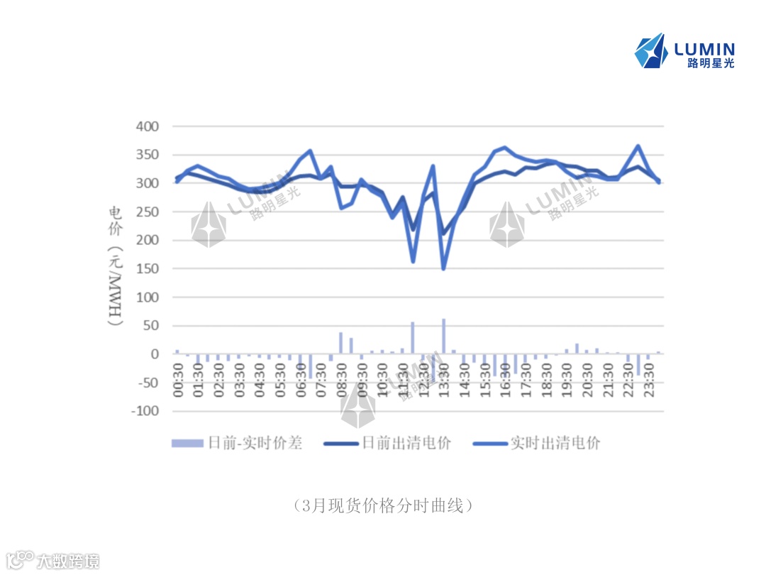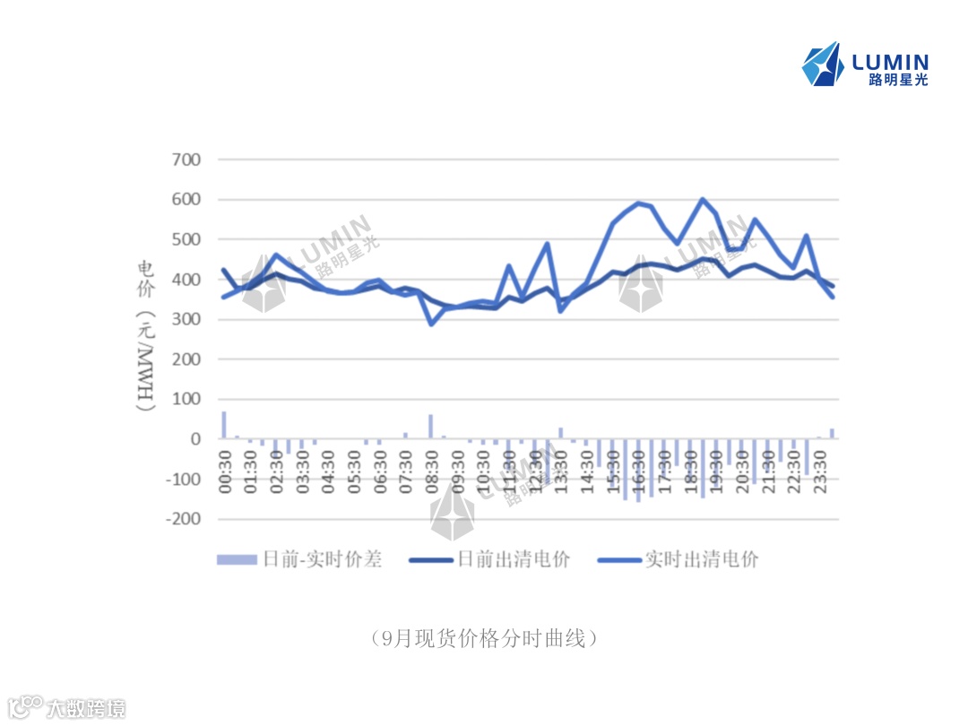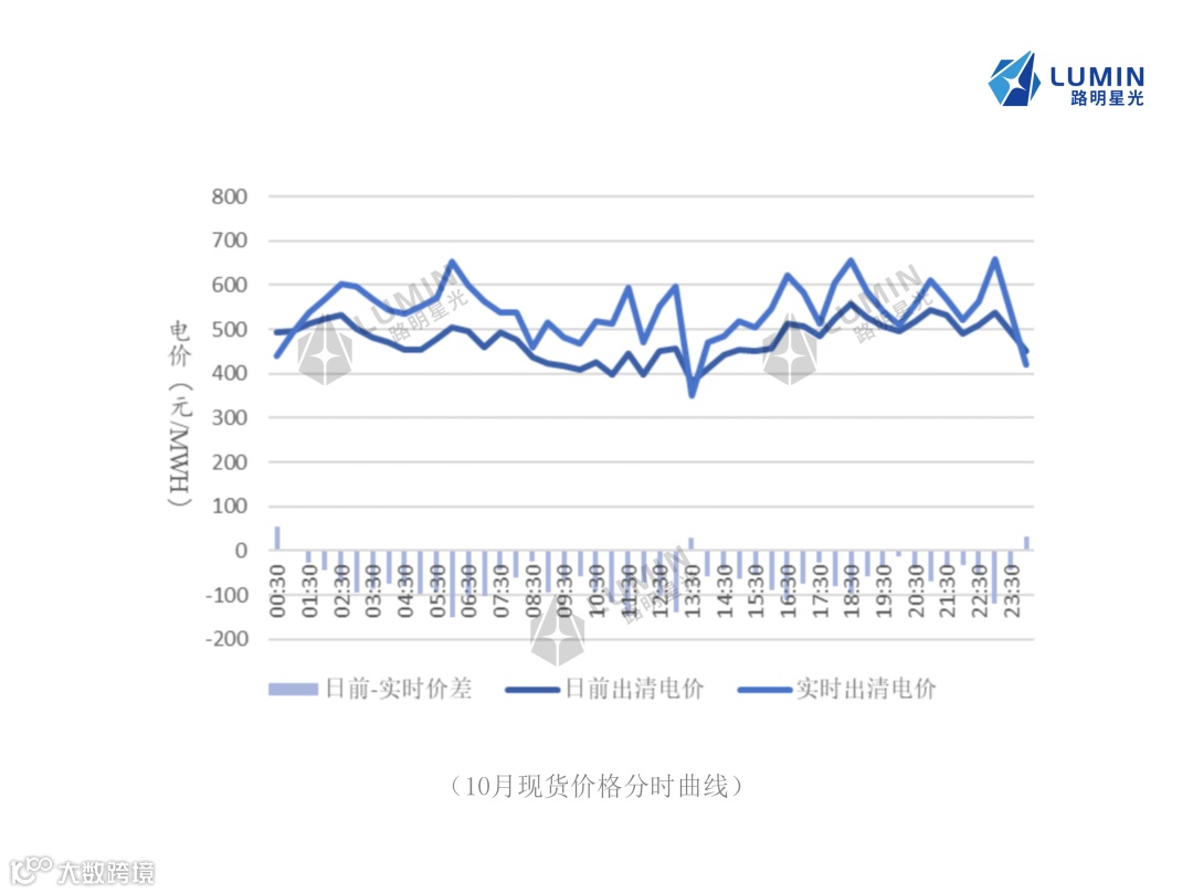 现货电价角度分析,上半年现货整体电价整体呈窄幅波动下跌趋势,1-4月现货整体价格在300元/MWh区间波动,受火电成本下降趋势影响,至6月下跌至年内价格低点239.97元/MWh;7-10月期间,受持续高温负荷持续上升、高负荷下电网阻塞、机组线路检修、燃煤价格回升等多因素综合影响,现货价格从7月的248.68元/MWh一路攀升至10月的485.36元/MWh,呈现单边上涨行情。