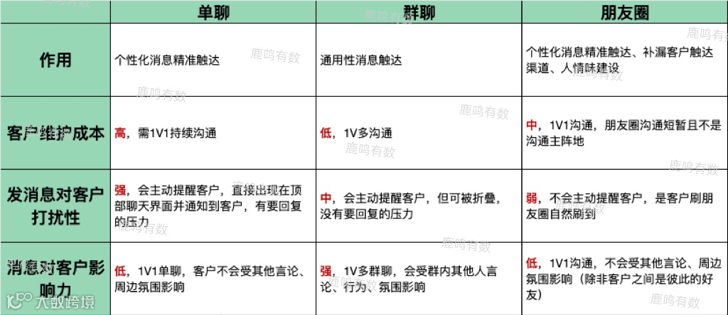 在消息对客户打扰性对比上,朋友圈小于群聊小于单聊。