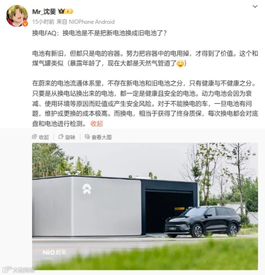 事实上,“烧钱”一直是蔚来摆脱不掉的一张标签。自换电模式诞生以来,就被视为是一种重资产和重投入的补能模式。不同车企电池接口、规格很难统一,导致换电站成为单一品牌的运营服务,造价成本昂贵。根据早期换电站数据来看,蔚来一二代换电站的造价分别约为300万元和150万元。粗略计算,蔚来在换电站建设上就花掉了50多亿元,还不包括后期1500多人换电团队的运营成本,以及电池储备、维修费用。尽管如此,蔚来仍对换电抱有期望。在蔚来2023年NIO Power Day上,蔚来联合创始人、总裁秦力洪坦诚道:“很多人说蔚来搞换电一直亏,前段时间亏得是多一点。我们也希望共同努力,亏得少一点,尽早盈利。”截至目前,蔚来已经建成充电站3225座、充电桩18845根,三方桩905410根,完成3000万次换电服务,为用户提供可充可换可升级的能源服务体验。在长途出行、换电数量大幅增长的十一长假期间,蔚来用户的平均全程换电时长(从距离换电站200米处下单开始,到换电结束,包括排队等待等)和平时几乎相当,在9到10分钟左右,其中高速换电25021次,大大满足了用户的出行需求。今年第四季度,蔚来还将推出“换电不断电”的升级功能,简言之在换电过程中,车辆不会断电,反而会继续为车主提供送风、影音娱乐等功能。 欢迎来到,换电时代 21世纪初,国内外就已经开展电动汽车换电模式的尝试,然而受限于政策环境、技术水平、成本因素和市场规模而没有得到大规模推广。2019年开始,中国电动汽车销量增速大幅放缓,补贴大幅度退出导致制造成本难以消化,整车销售价格仍然偏高,同时由于充电基础设施效率不足、自有停车位欠缺、电网配合扩容难度较大等导致充电桩建设不及预期。在此背景下,车电分离开始受到关注。换电模式作为电动汽车的一种新的补能方式,得到了国家政策的大力支持。2020年,全国两会在《政府工作报告》中把充、换电一并纳入“新基建”的范畴,工信部等相关部委也多次提出鼓励换电模式发展的建议,一时间让没有太多人关注的换电模式,成为行业纷纷讨论的焦点。数据显示,2022年,中国换电站保有量增至1973座,较上一年度增长了52%。集中分布在华东地区,占比达到37.4%,其次是华北地区,占比为20.73%。这主要是由于换电技术还处于技术研发升级阶段,对人才和技术的需求多。