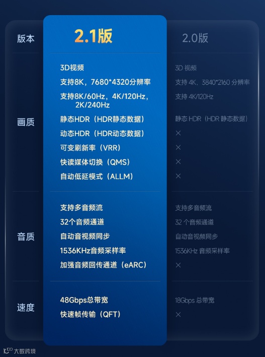 HDMI 2.0支持60帧的4K图像、30帧的8K图像。而HDMI 2.1支持120帧的4K图像、60帧的8K图像。