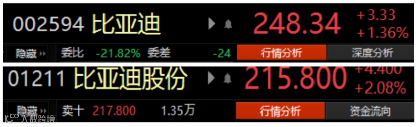 受业绩数据影响,3月29日早盘,比亚迪A股H股齐涨。9时40分,比亚迪A股涨1.36%报248.34元,H股涨2.08%报215.8港元。