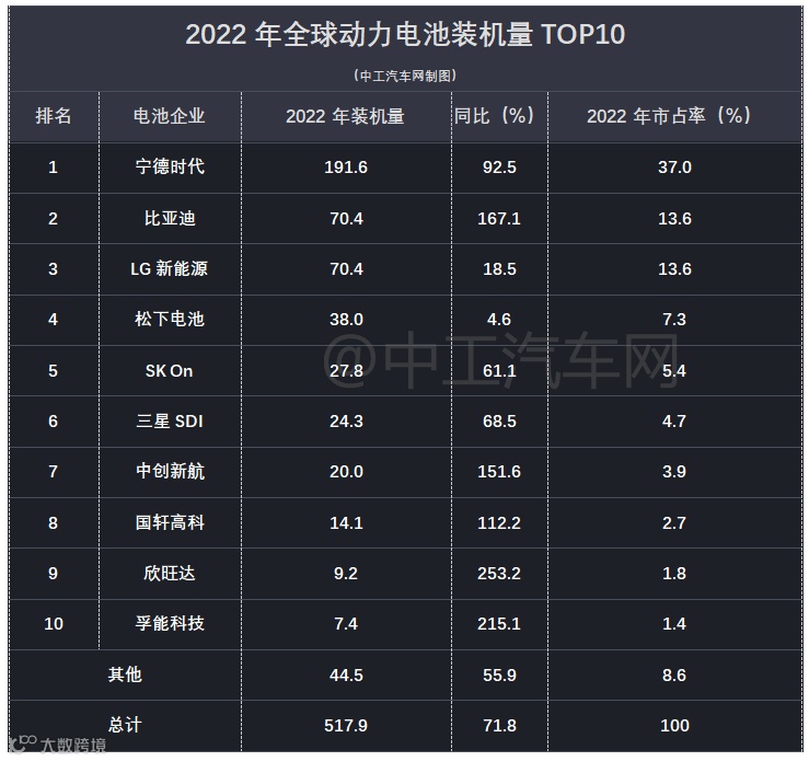 近年来,中国新能源汽车渗透率再度爆发,作为新能源车的“心脏”,动力电池的产业格局正加速重构。据韩国SNE Research统计,2022年全球电动汽车动力电池装机量约为517.9GWh,同比增长71.8%。