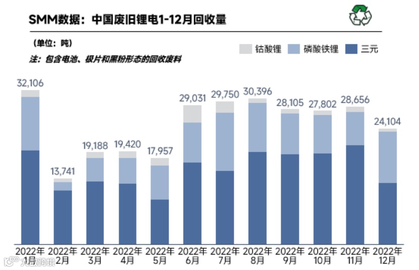 2022年12月国内废旧锂电回收共24,104吨,包含电池、极片和黑粉形态的回收废料,回收量环比减少16%。按回收电池种类统计回收量数据,2022年12月废旧三元共回收12,760吨,废旧磷酸铁锂回收10,677吨,废旧钴酸锂667吨。