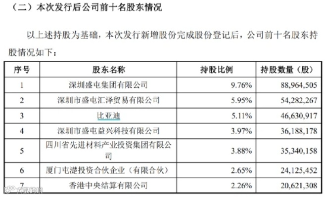中工汽车网消息,12月6日晚间,锂盐头部企业盛新锂能披露定增结果,此次非公开发行股份的数量为4663.09万股,调整后的发行价为42.89元/股,募集资金总额超过20亿元,发行对象为比亚迪股份有限公司。本次发行完成后比亚迪将成为公司持股5%以上的股东,且比亚迪董事会秘书李黔为公司董事,比亚迪及其控股子公司为公司关联方。