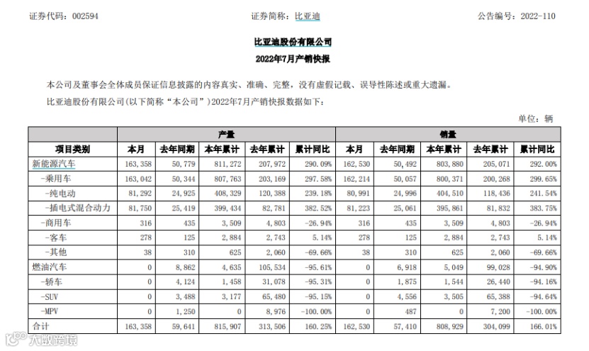 与此同时,8月3日晚间,比亚迪7月产销数据出炉。7月,公司新能源汽车销量16.25万辆,上年同期5.05万辆,同比增逾220%。而这已经是比亚迪连续第5个月销量破10万辆。今年前7个月,比亚迪新能源汽车累计产量81.13万辆,同比增长290.09%;累计销量80.39万辆,同比增长292%。