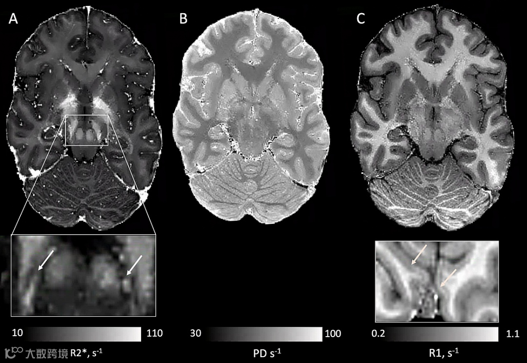Subnuclei within SN are visible on quantitative R2* maps (arrowed).
