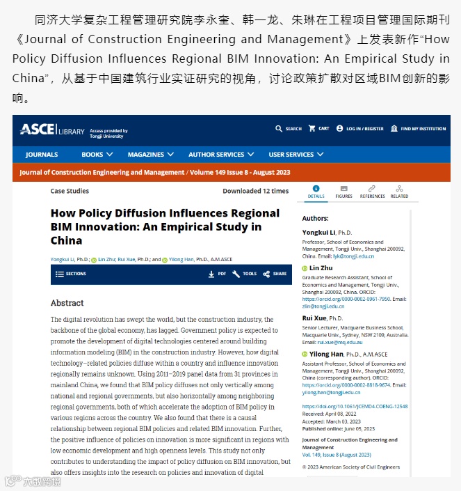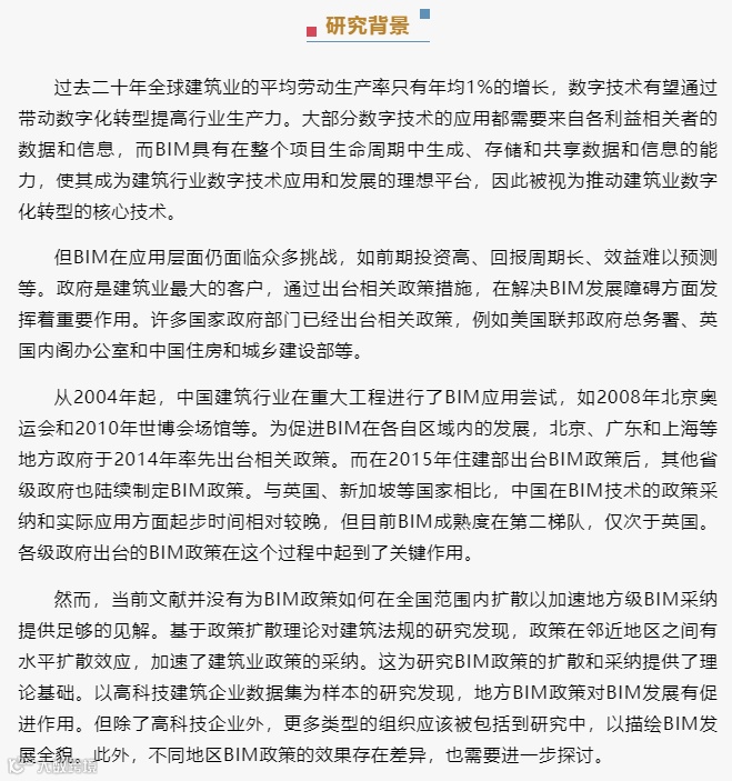 导读:本研究从地方级BIM政策有效性差异的角度解释了BIM创新的地方性差异,为BIM发展的区域不平衡性研究提供了新的视角。