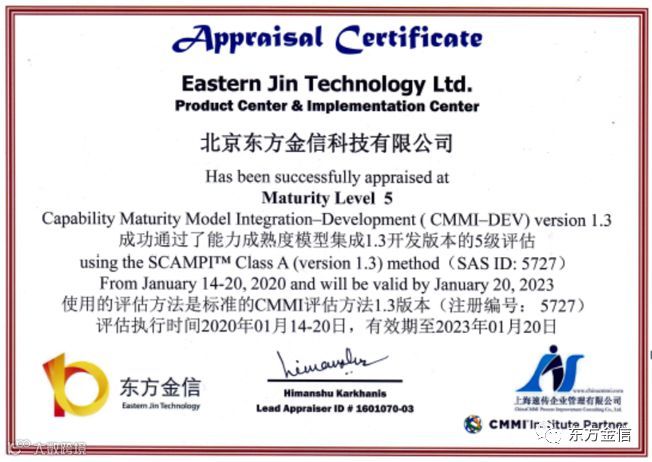 近日,北京东方金信科技有限公司(后简称“东方金信”)正式通过了CMMI5级评估认证,并获取CMMI5级认证证书。这是国际软件业最高等级认证,标志着东方金信已经具备顶级软件成熟度,研发能力和管理水平已经达到国际标准。
