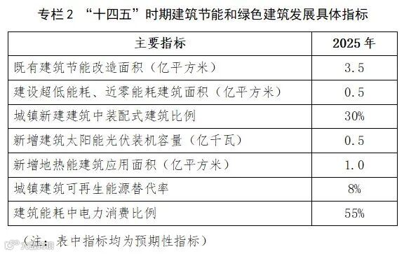 到2025年,完成既有建筑节能改造面积3.5亿平方米以上,建设超低能耗、近零能耗建筑0.5亿平方米以上,装配式建筑占当年城镇新建建筑的比例达到30%,全国新增建筑太阳能光伏装机容量0.5亿千瓦以上,地热能建筑应用面积1亿平方米以上,城镇建筑可再生能源替代率达到8%,建筑能耗中电力消费比例超过55%。