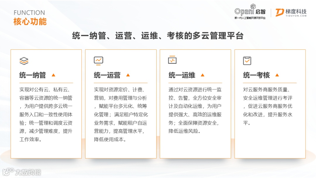 这是我们平台主要包含的四个核心功能模块,第一是包含公有云、私有云以及容器云等各类云平台的统一纳管,第二是基于多租户体系的定价计费、营销分析等功能的统一运营,第三是实现对云资源监控、告警、自动化运维的统一运维,第四是作为中立平台提供对云服务商考评体系的统一考核。