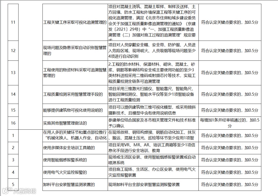 为加快推进北京市房屋建筑和市政基础设施工程科技创新和智慧工地创建,进一步明确建设工程智慧工地做法实施标准。近日,北京市住房城乡建设委对《北京市住房和城乡建设委员会关于激励本市房屋建筑和市政基础设施工程科技创新和创建智慧工地的通知》(京建发〔2021〕27号)智慧工地示范做法内容进行了细化,制定了《北京市房屋建筑和市政基础设施工程智慧工地做法认定关键点》。