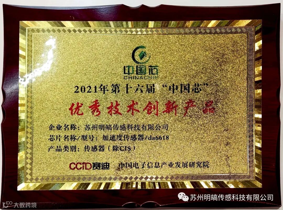 “2021年12月20日,在广东珠海国际会展中心召开的2021年第十六届“中国芯”集成电路产业促进大会上,苏州明皜传感科技有限公司自主研发的「da6618加速度传感器芯片」荣获「中国芯优秀技术创新产品奖」。”