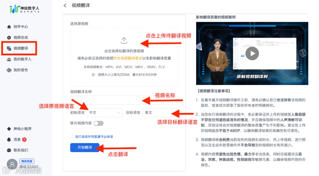 当然,神绘数字人web端也有视频翻译功能,操作过程非常简单方便,可参考下图——