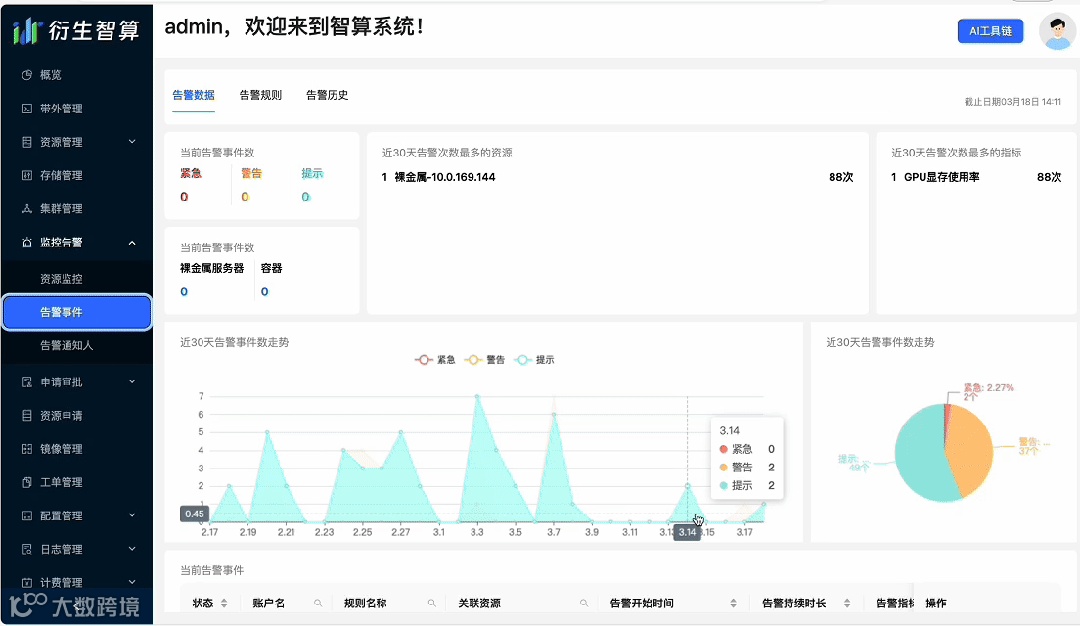 衍生智算系统为学校、政企单位、科研机构等组织提供了算力资源智能化管控的解决方案。高校等组织的运管人员通过衍生智算系统的监控告警功能可以对资源进行精细化管控,进行实时监控告警可以优化资源使用、提高运营效率。如在资源监控栏可动态查看整机设备或单个设备的使用状况,可查看用户对资源的使用情况以提醒相应的用户资源的扩容或回收;基于监控结果,可以通过定义各种告警级别方便运管人员及时介入,运管人员可以制定告警规则,当用户使用资源达到设定阈值时就会收到系统自动发出的告警信息,由此形成监控告警闭环。