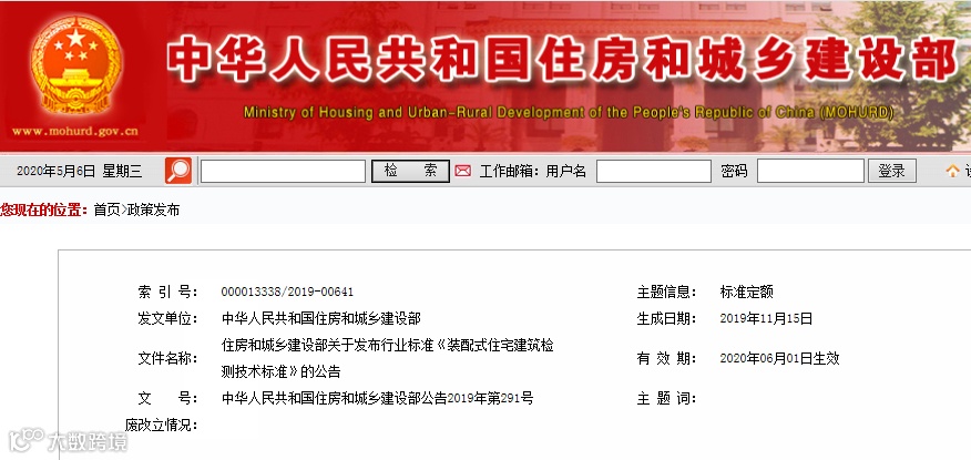 现批准《装配式住宅建筑检测技术标准》为行业标准,编号为JGJ/T485-2019,自2020年6月1日起实施。
