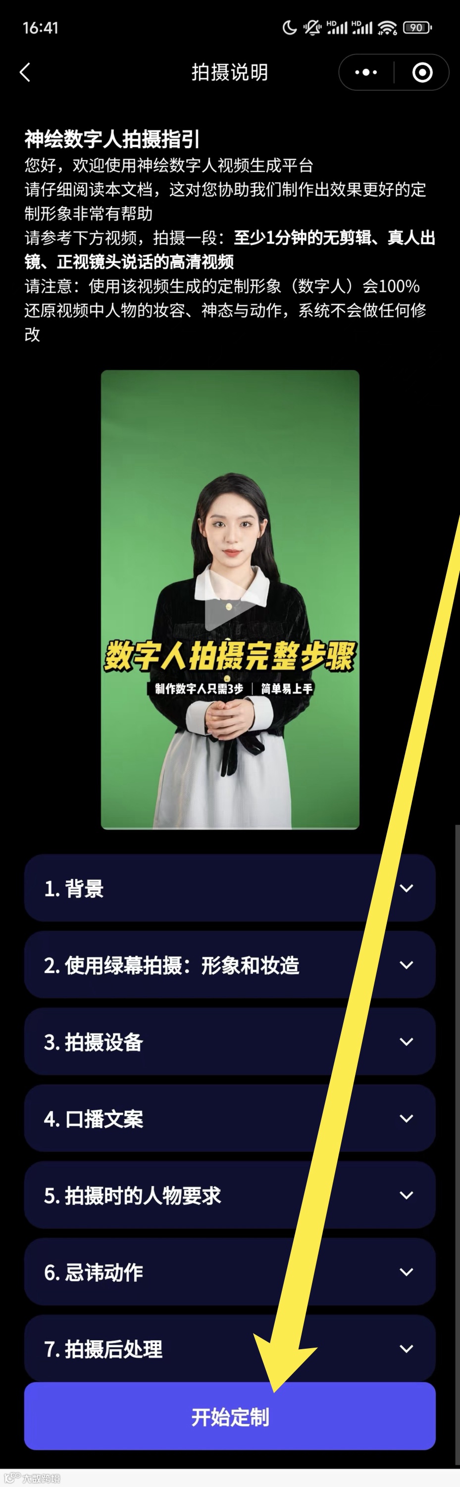 6、查看拍摄说明后,点击“开始定制”