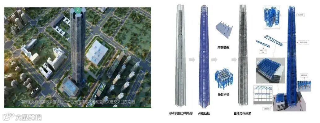 中国国际丝路中心大厦项目,塔楼建筑高度498m,建成后将成为西北地区高度第一的超高层建筑。总建筑面积38万m²,地下4层,主塔楼地上100层。塔楼采用核心筒剪力墙+外框巨柱,工程钢结构含量约7万吨。主要业态为5A级办公、五星级酒店、国际会议中心、精品商业、观光等。