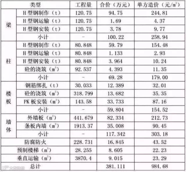 预制装配式钢框架上部主体结构造价如下表所示: