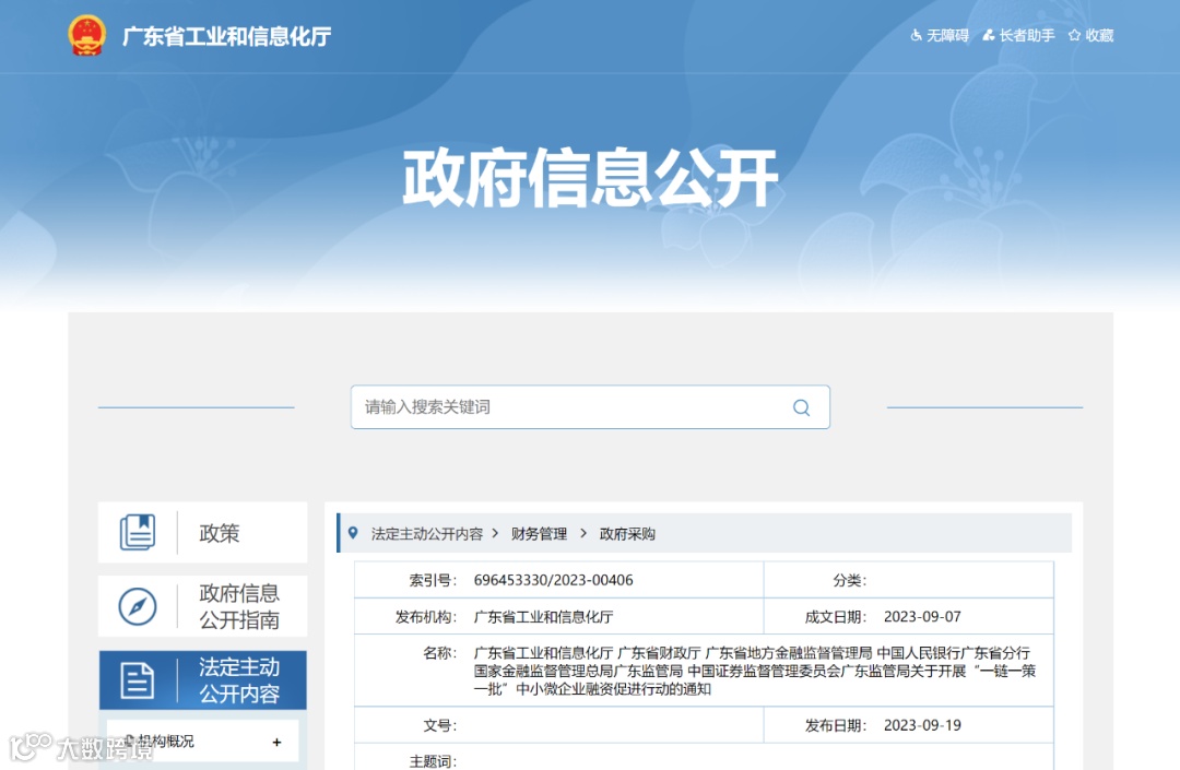 9月19日,广东省工业和信息化厅、广东省财政厅、广东省地方金融监督管理局、中国人民银行广东省分行、国家金融监督管理总局广东监管局、中国证券监督管理委员会广东监管局联合发布《关于开展“一链一策一批”中小微企业融资促进行动的通知》(以下简称“通知”),要求提高认识,深入推动融资促进行动落地见效;结合重点工作,持续加大工作力度;加强部门协同,建立长效工作机制。