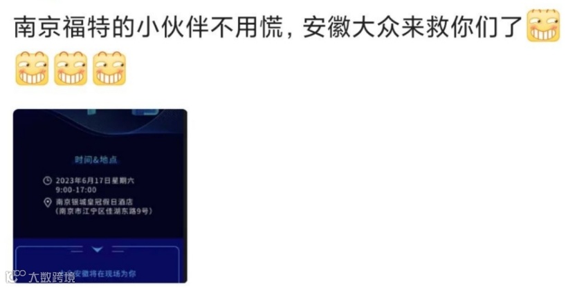 值得注意的是,在福特开启裁员之时,其他车企也盯上了这些被裁人员。有网友爆料,本周六,大众安徽在南京开启现场招聘会。有网友调侃“大众安徽作为安徽企业,来徽京招人也很合理”。