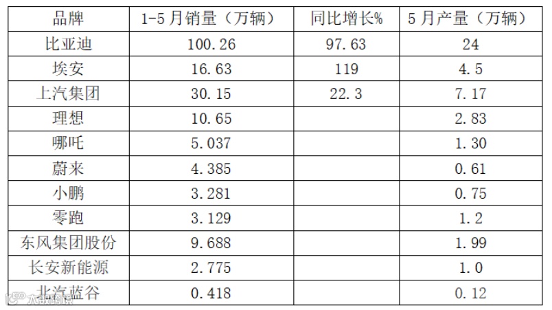 综合来看,1—5月,比亚迪销售新能源汽车100.26万辆,同比增长97.63%,完成年度销量目标300万辆的近三分之一。