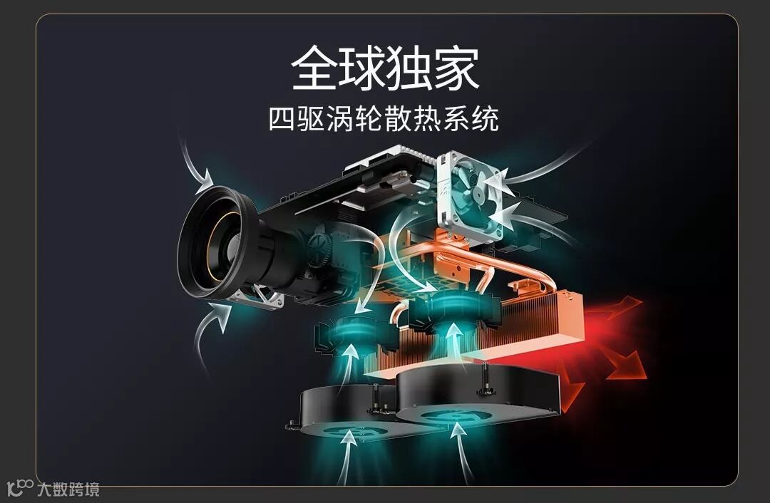 4.全球独家四驱涡轮散热系统,投影仪技术中有一个难点就是光的利用效率只有25%左右,大部分的光通过热量散出来,风扇太少,热量散不出来。风量太大会造成整机噪音,大眼橙X10的四驱涡轮散热技术让风速增强65%,散热效率提升22%。