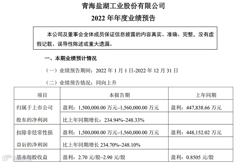 中工汽车网消息,1月11日晚间,盐湖股份发布2022年业绩预告,公司预计实现净利润150亿元—156亿元,比上年同期增长234.94%—248.33%;扣非净利润150亿元—156亿元,比上年同期增长234.7%—248.1%;基本每股收益2.7元/股—2.9元/股。