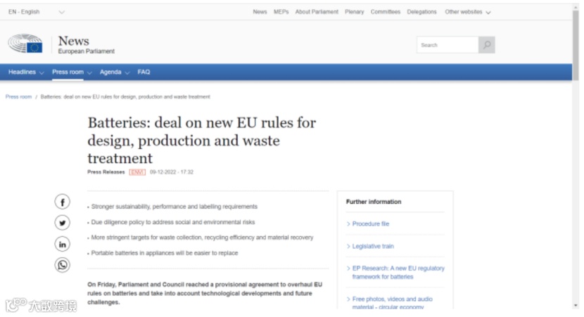 今日,“欧盟《新电池法》相关消息”登上微博热搜榜。具体来看,该法规旨在通过针对电池生命周期的所有阶段,从设计到废物处理,为电池行业创造循环经济。虽然《新电池法》的生效还需要欧盟议会和欧盟理事会正式批准,但是法案具体内容已经敲定。