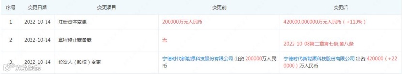 10月18日消息,近日,四川时代新能源科技有限公司发生工商信息变更,该公司的注册资本由20亿元人民币变更为42亿元人民币,增幅达110%。据悉,为满足业务大幅增长和质量提高的预期,宁德时代在宜宾市建立大型工厂—四川时代。