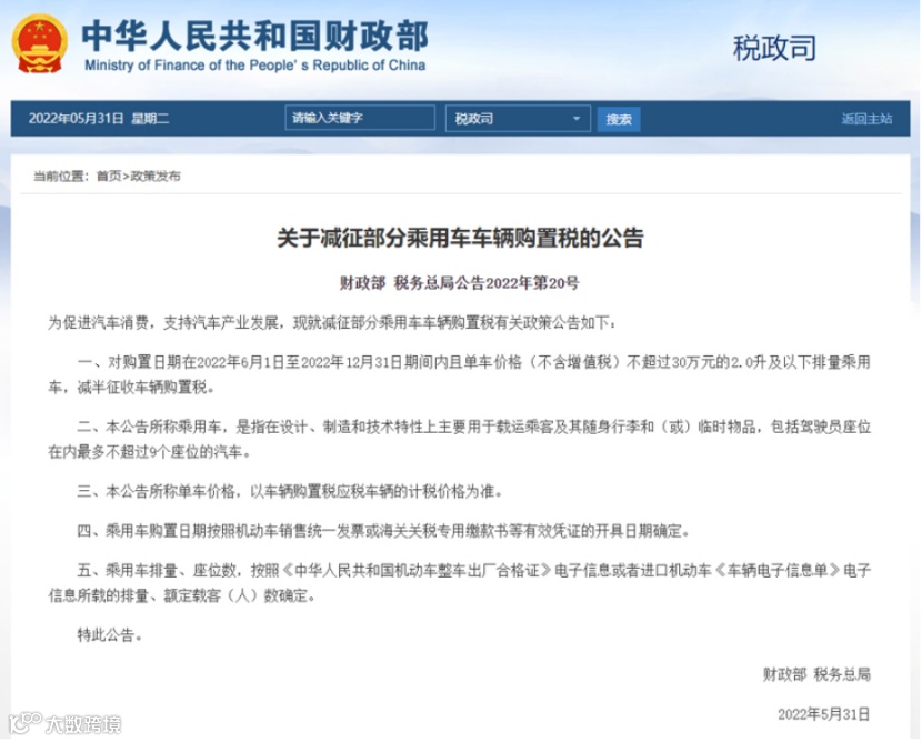 中工汽车网消息,5月31日,财政部、国家税务总局正式发布《关于减征部分乘用车车辆购置税的公告》: