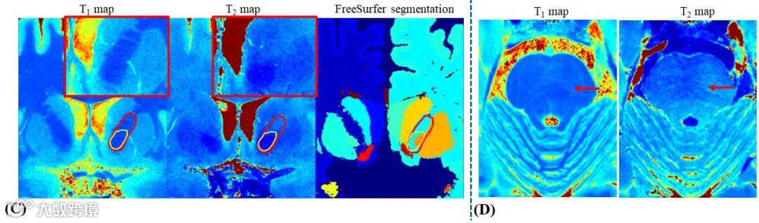 (1C) The red-labeled region has similar T1 values, leading T1-weighted segmentation to classify this region as gray matter. However, in the T2 map, the yellow-labeled area shows lower T2 values.