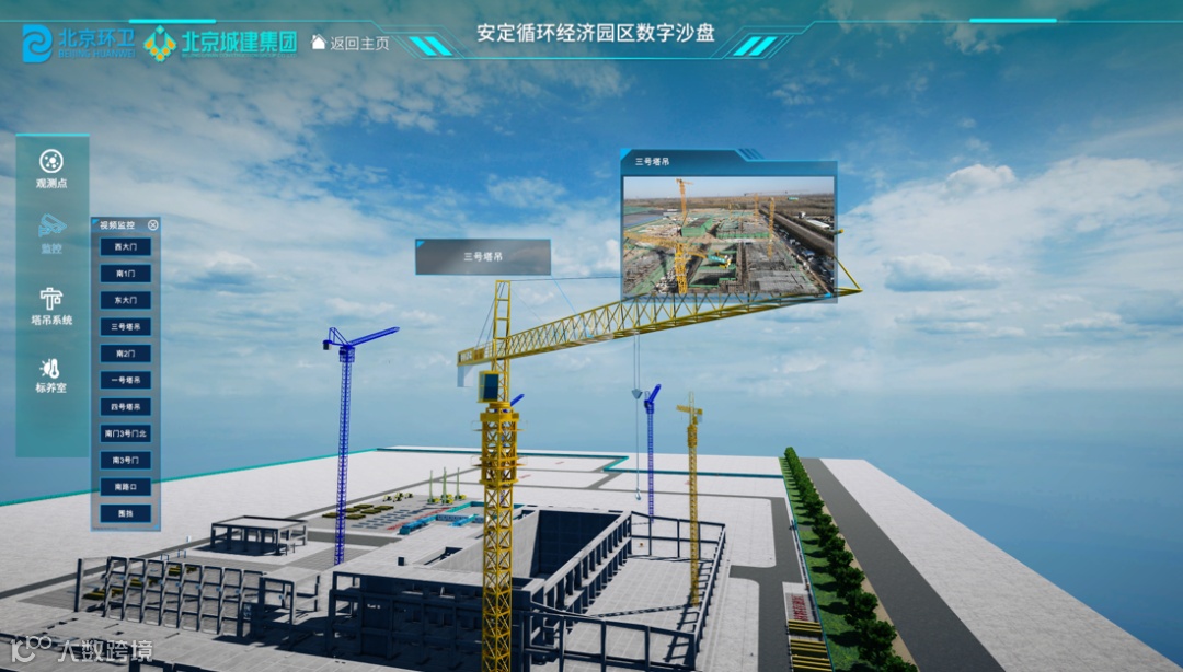 集团和公司端场景均可总览全集团或全公司的所有项目的基本情况,对关键数据进行统计分析,比如人员数量、大型设备数量、中标或在施项目数量及中标总合同额等,同时亦能随时调取项目现场实时监控,如图5和图6。项目端场景可总览整个工程项目的基本情况,可监测工程进度、施工现场人数、PM2.5值、施工噪音等,如图7(a),也可监测施工现场主要出入口、材料区、塔吊系统等关键位置,如图7(b)。手机端场景能够随时随地查看工程项目信息,包括视频监控、人员统计、环境监控、进度计划、隐患排查、设备物资等情况,如图8。
