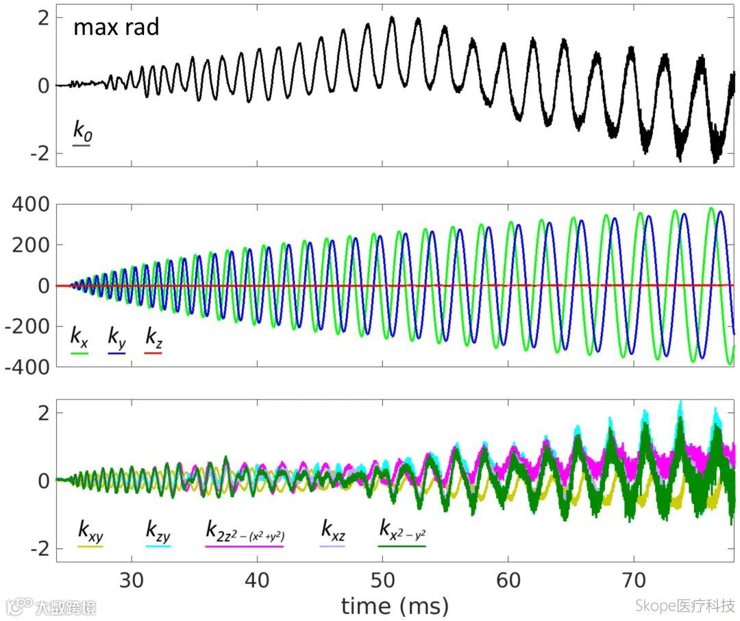 监测磁场动态的相位展开结果:自上而下为零阶、k空间轨迹(第一阶)、第二阶球谐展开项。