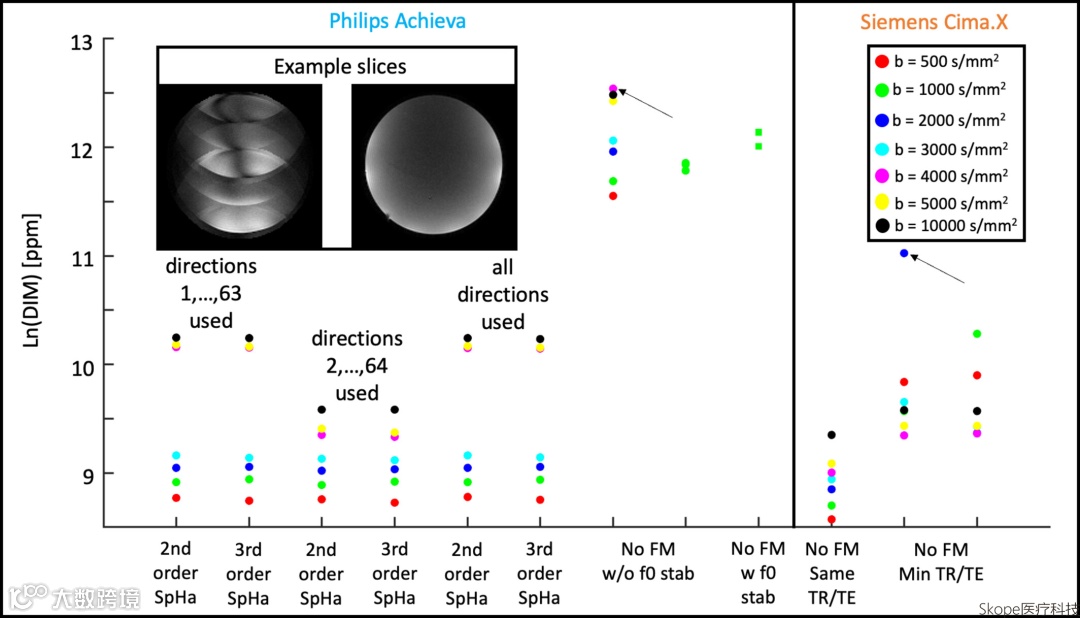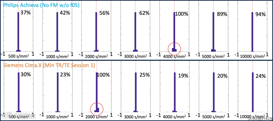 红圈标出某些高b值数据(Philips Achieva b=4000,和Siemens Cima.X b=2000)的明显异常值,同样对应着DIM值过大。