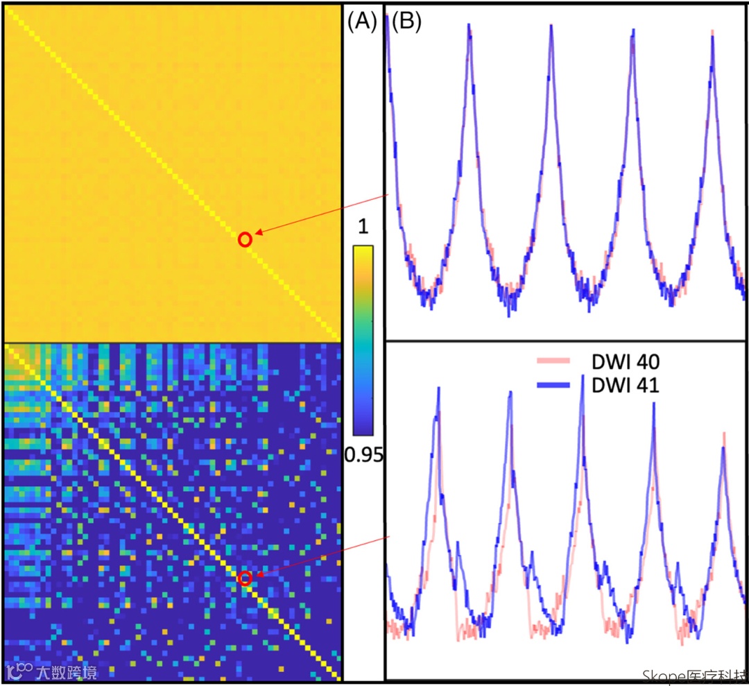 左侧是不同扩散方向之间的相关系数矩阵:上行为质量较好的数据集,下行为质量较差的数据集。红色圆圈标出了第 40 与第 41 张 DWI 之间的相关系数,该系数由对应的完整起伏曲线计算得到(即矩阵 X̂ 列中重整后的信号体素强度),其中的一部分曲线呈现在右侧上下两张图(来自同一模体在第40与第41个扩散方向的信号强度)。