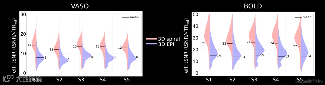 3D spiral在VASO中平均tSNR约为18,明显高于EPI的10,而BOLD中的提升幅度也很显著。