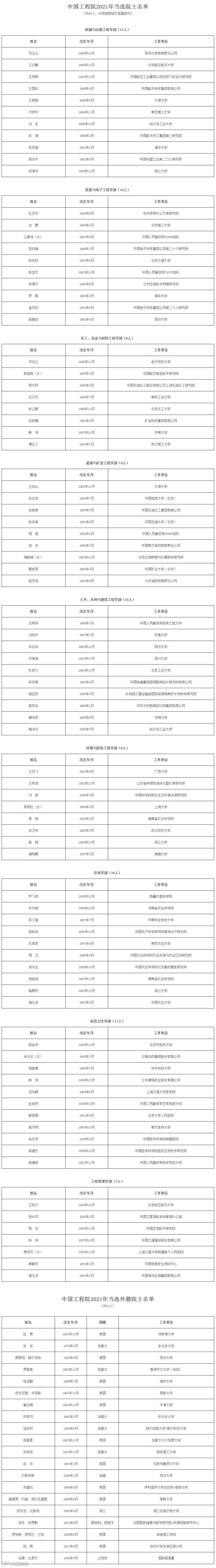 根据《中国工程院院士增选工作实施办法》等规定,中国工程院2021年院士增选共选出中国工程院院士84人,其中女性科学家6人。在新当选中国工程院院士中,机械与运载工程学部11人,信息与电子工程学部10人,化工、冶金与材料工程学部8人,能源与矿业工程学部9人,土木、水利与建筑工程学部10人,环境与轻纺工程学部8人,农业学部10人,医药卫生学部11人,工程管理学部7人。